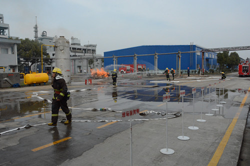 本次演練分為技能表演賽和事故演練兩個(gè)部分。技能表演賽由本公司專(zhuān)職消防隊員參加實(shí)施,內容包括:“原地佩戴空呼器、水帶出水實(shí)操、著(zhù)消防服堵漏”三個(gè)消防技能項目;事故演練部分內容分為“車(chē)間制冷工段液氨泄露事故應急救援演練”和“生產(chǎn)車(chē)間火災事故應急救援演練”兩個(gè)項目,演練人員由南湖區消防大隊、大橋鎮、中華化工專(zhuān)職消防隊三支訓練有素的消防隊伍組成,中華化工企業(yè)職工、南湖區安監局、環(huán)保局等相關(guān)工作人員共計50余人參加了事故應急救援演練。