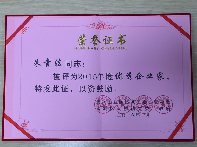 2016年1月28日,南湖區大橋鎮(嘉興工業(yè)園區)2015年度總結表彰大會(huì )在鎮政府禮堂順利召開(kāi),我公司憑借較好的業(yè)績(jì),榮獲了2015年度大橋鎮“十強”工業(yè)企業(yè)和納稅超五千萬(wàn)元突出貢獻獎;朱貴法榮譽(yù)董事長(cháng)榮獲“優(yōu)秀企業(yè)家”榮譽(yù)稱(chēng)號。