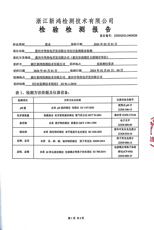 報告名稱(chēng):2024年中華熱電3月廢水檢測報告